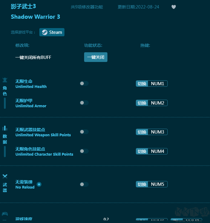 影子武士3修改器是一款专为游戏《影子武士3》打造的强力游戏辅助工具。九项游戏辅助功能包括无限生命,无限护甲,无限技能点,无需装弹等等,帮助玩家成为最强的武士,轻松击杀BOSS。感兴趣的朋友不要错过,KK下载站推荐大家下载体验!