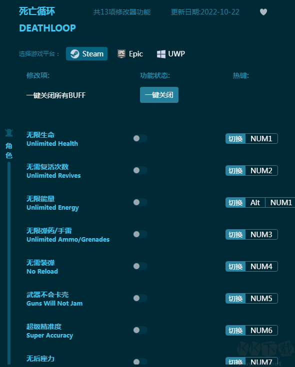 《死亡循环》是一款次世代射击游戏。打破时间循环你才能找到真相。这款《死亡循环修改器》能够为玩家带来无限生命,无限能量,无限弹药,超级精准度,无后坐力等丰富的游戏修改功能,让玩家的游戏更爽快!感兴趣的朋友不要错过,KK下载站推荐大家下载体验!