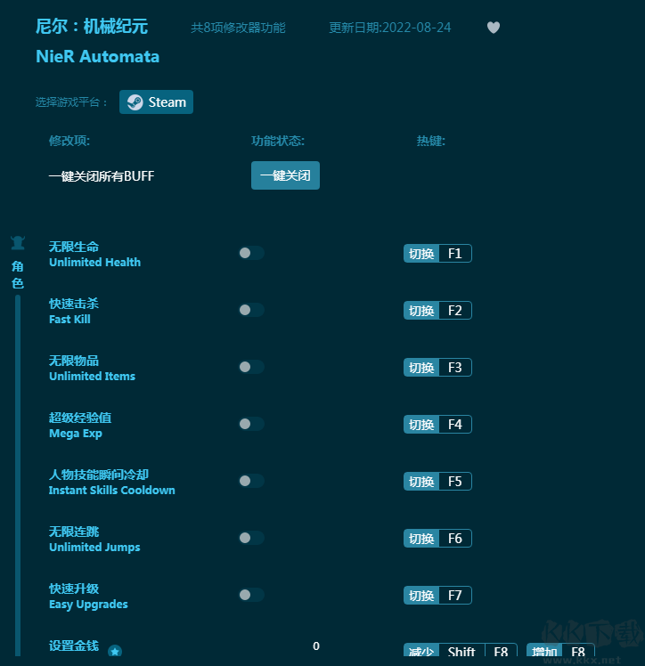 《尼尔机械纪元》是一款经典动作冒险游戏,这款《尼尔机械纪元修改器》能为玩家降低游戏难度,体验更全面的游戏内容。内置无限生命,快速击杀,无限物品,超级经验值,技能瞬间冷却,无限连跳,快速升级等等众多游戏帮助,让玩家的游戏体验更轻松愉快!感兴趣的朋友不要错过,KK下载站推荐大家下载体验!