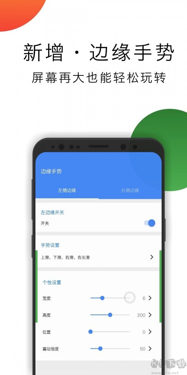 导航边缘手势是一款为大屏手机打造的便捷软件,可以通过手势在其他界面进行程序的快速启动,支持Home键、返回键,长按电源键等,体积小功能多非常便捷实用,目前支持14种手势!