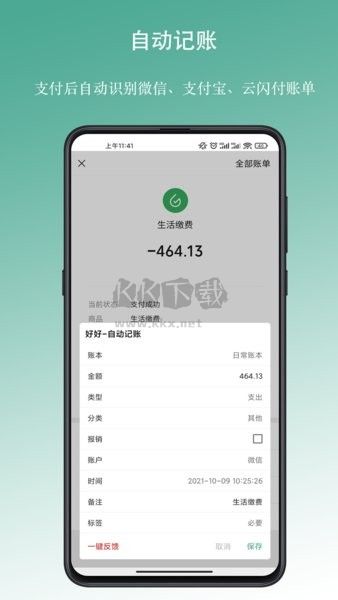 支付后自动识别微信、支付宝、云闪付,周期记账、快速记账。
