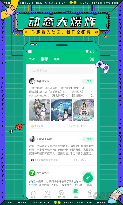 7723游戏盒是一款实用的手机游戏下载工具软件,包含了游戏下载,社区互动,UP资源,有趣工具等多种不同功能,同时有攻略礼包,好友聊天,赚取每日积分兑换等特色!