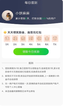 2, 天天签到领奖励金,连续签到兑换各种大红包,签到周期为7天,连续签到满7天累计奖励金币,可兑换成现金红包提现。