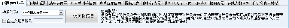 瞬间更换场景/自动喊话器/消除等待状态/屏蔽玩家/鼠标连点器/仿VIP(飞行 卡位 仓库 图鉴 屏蔽玩家)/在线人数查询/自定义脚本模拟