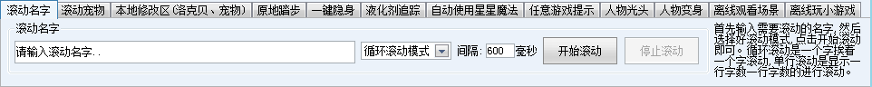 滚动名字/滚动宠物/本地修改区(洛克贝、宠物)/虚拟对战/原地踏步/一键隐身/液化剂追踪/自动使用星星魔法/任意游戏提示/人物变身/离线观看场景/离线玩小游戏