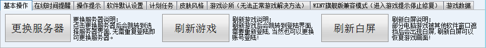 基本操作/在线时间提醒/操作提示/软件默认设置/计划任务/皮肤风格/游戏诊所(无法正常游戏解决方法)/WIN7旗舰版兼容模式(进入游戏提示停止修复)/运行数据