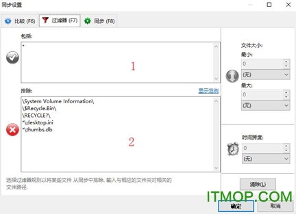 文件大小为零的过滤器设置文件大小过滤器,下限为0个字节。 时间跨度和文件大小过滤器仅匹配文件,因此这将排除所有文件夹。 然而,在同步期间,如果一些排除的文件夹包含至少一个非排除的项目,即当它们不是空的时,它们仍将被同步