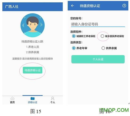 4.再次回到(图15)界面,点击“待遇资格认证”,在出现的待遇资格认证界面中选择认证的险种“城乡居民养老保险”(图16红圈中)。