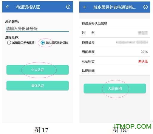5.在(图17)中输入需要认证人员的身份证号码,并点击“个人认证”,随后即出现待遇资格认证信息(图18),核对信息无误后,点击“人脸识别”进入认证程序。