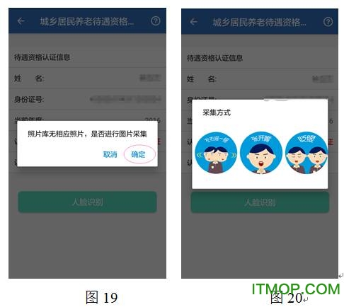 6.若屏幕显示“照片库无相应照片,是否进行图片采集”(图19),说明认证系统中没有该认证人员的照片,需要现场采集。点击“确定”按钮进入“人脸采集”。人脸采集有三种方式:头部左右摇一摇、张开嘴、眨眼,选择其中一种方式进行采集照片(建议选择张开嘴或者眨眼方式进行采集照片)(图20)。
