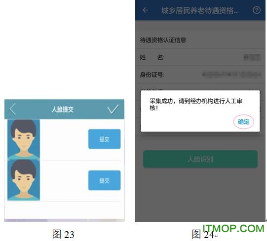 7.仔细阅读“提示”内容,并点击“开始”(图21),随后按照语音提示进行人脸采集(图22)。采集成功后,选择较清晰的正脸照片,点击“提交”按钮上传照片(图23)。上传照片成功后,还需社保经办机构进行人工审核,点击“确定”(图24)。