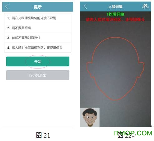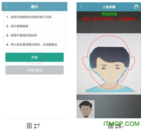 9.仔细阅读界面“提示”(图27)后,点击“开始”,并按照语音提示,将图中模拟头部线框对准认证人员头部(图28),做出相应的“摇头”、“张嘴”或者“眨眼”动作,进行照片比对匹配认证。
