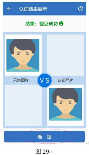 10.照片比对成功,则在“认证结果展示”界面中显示“结果:验证成功”(图29),并有原采集照片和本次认证照片的比对图。点击“确定”,完成认证。
