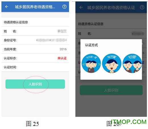 8.若程序中已采集有照片的,进入待遇资格认证信息界面(图25),核对信息无误后,点击“人脸识别”,在随后出现的三种认证方式中(图26)选择其中一种进行认证(建议选择张开嘴或者眨眼方式进行认证)