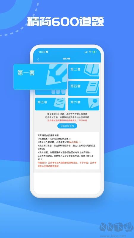 3天包过,5套试题,真实还原交管局考题难度,按照顺序练习做题,所有法规一个不漏,准确把握考试难点。