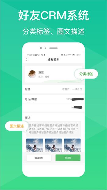 体验到更加靠谱的操作方法,随时随地都可以联系你的好友进行实时的沟通,让你们的关系变得更加的紧密,打造出了好友CRM的系统,以标签和图文的方式进行描述,对所有的好友信息做到一目了然。