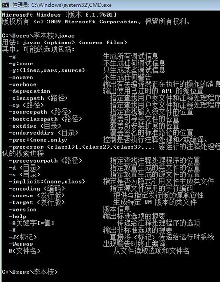 2、输入javac,正确就显示如图