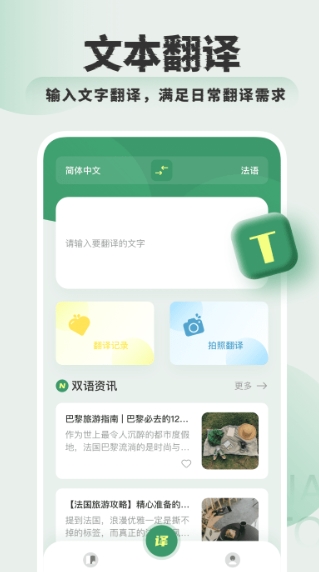 《银叶实时翻译软件安卓版》是一款专业的手机实时翻译法语软件,及时双语资讯,带你了解法国,开拓视野,欣赏巴黎的浪漫,相应文字快速翻译成法语,可拍照翻译,语音翻译,视频文件自动翻译,赶快来下载体验吧。