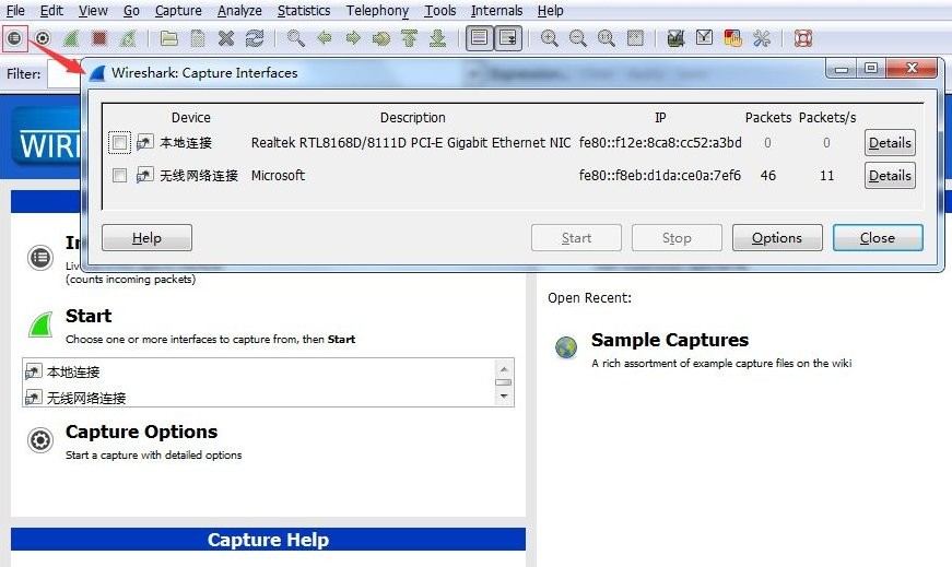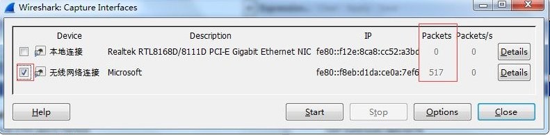 如果不确定是那个网络接口,则可以看packes项数据变化最多接口,选中它然后点击"start"开始抓包。