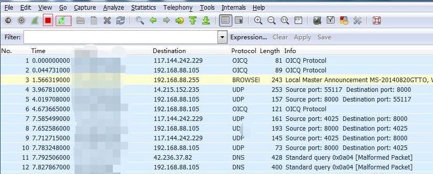 开始抓包后,可以看到各通过该网络接口的数据报文被抓取到。