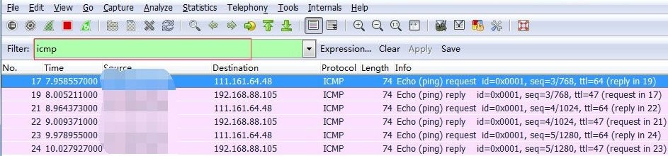 如果想要只看自己关心的数据包,则可以在"Filter"栏中输入过滤条件即可。