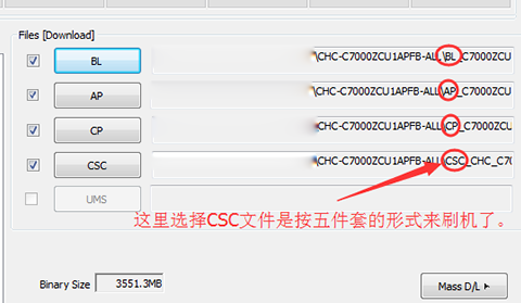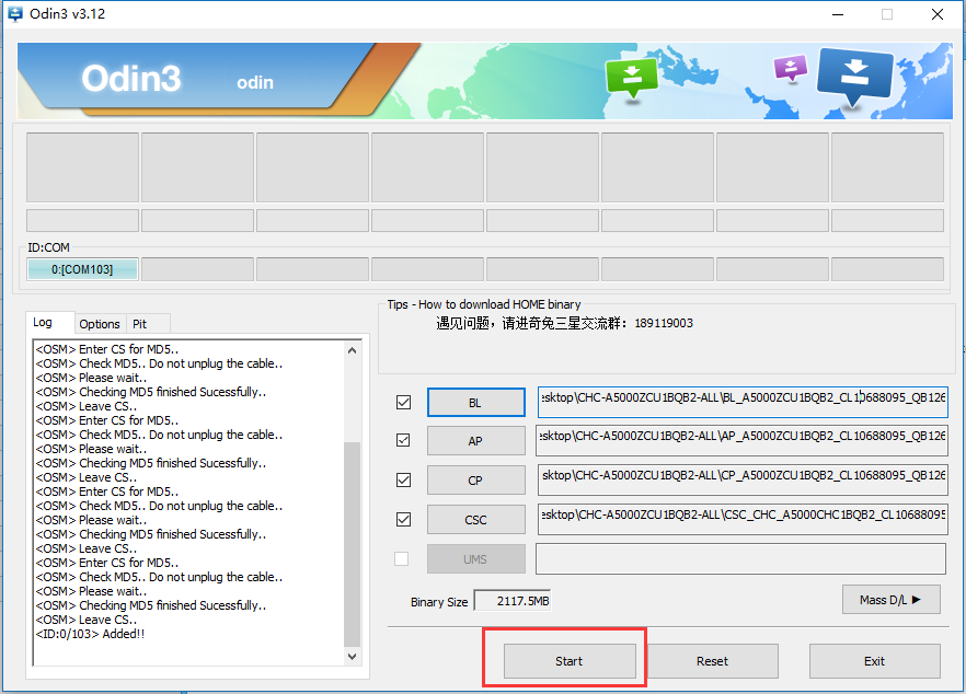 2、在PC端启动Odin3,在对应的位置打上勾与选择正确的刷机文件。