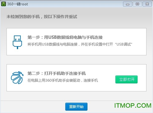 3.第四步当然是按照里面步骤一步步操作,安装手机驱动,这里可以通过360手机助手,然后根据自己手机系统,4.0以下点击设置,应用程序,调试,开发和未知源打钩,安卓4.0和4.0以上系统点击设置,应用程序调试打钩。具体请参考【安卓手机设置USB调试模式教程】然后使用手机专用数据线连接至电脑,点击重新开始,如果一切顺利的话,360一键root会提示你成功,如果成功会得到下面如图所示