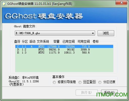 5、不修改mbr,对系统盘的操作,将转到dos下完成操作,重启时会自动把启动项修改为默认启动硬盘安装器,运行后恢复原样;WinPE下运行,或对非系统盘的操作,使用ghost32.exe在当前系统下运行。