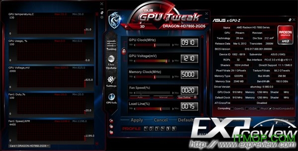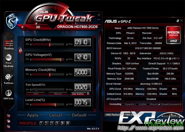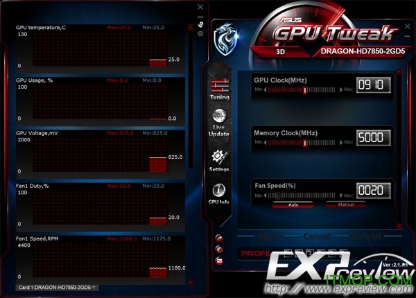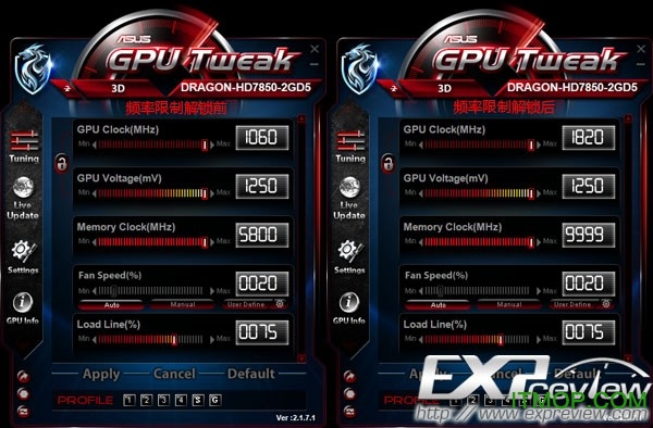 GPU Tweak的功能在此已经全部介绍完毕,它的功能非常全面,可以全面覆盖NVIDIA与AMD的显卡,无论哪个品牌的显卡都能够使用GPU Tweak进行超频,另外软件还可以轻松的解除频率的上限,玩家不需要再被限制约束,可以冲击更高的频率。目前新版的GPU Tweak已经可以把HD 7850的电压提升到1.3V了。