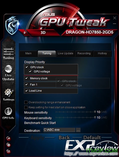 Tuning有两个设置比较重要,第一个就是红框中的解除频率限制选项,第二个就是开卷自动载入超频设定选项,下面的“Mouse sensitivity”和“keyboard sensitivity”则是改变用鼠标或者键盘调节频率等数值时没点解一下的变化数值,默认都是10,另外快速启动指定测试程序也是在这里修改程序路径。