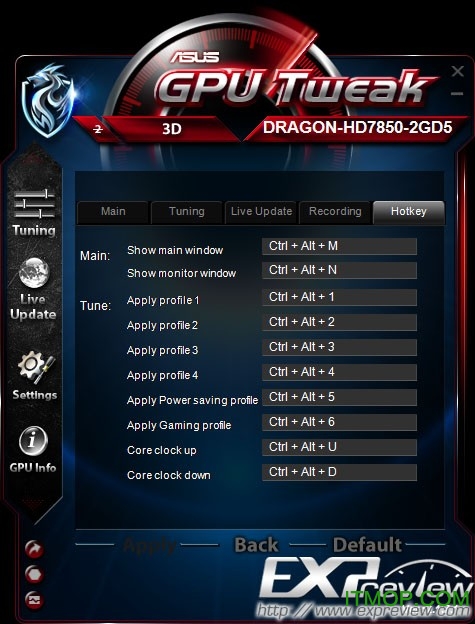 GPU Tweak还支持热键功能,可以设置不同的热键组合,玩家可以在游戏中实时调整显卡的频率。