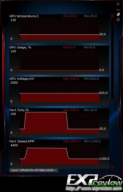 固定转速的话有个坏处就是不够灵活,太低可能会让显卡过热,而太高的话噪音也很烦人,使用这个功能用户可以设置不同温度情况下的风扇转速,只需要设置好上图那个图表就可以了,最多可以提供9个折点,这样的控制更为灵活,可以避免显卡过热的情况。