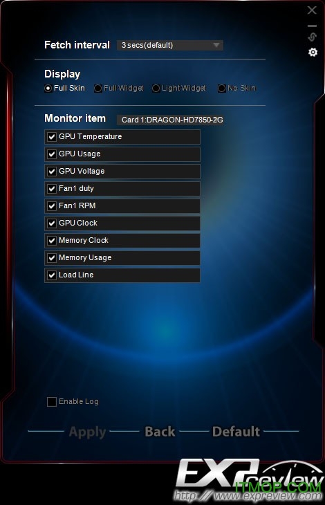 GPU Tweak的显卡信息监控功能是非常强大,显卡的所有信息都可以实时显示并记录下来,窗口可以独立拉出来,也可以更换各种不同的皮肤,软件的底部选择框可以更改监控的显卡。