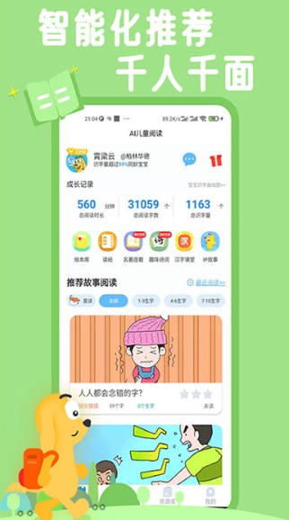 2. 根据用户的识字量会推荐对应的故事以及课程,50小时的阅读时间认识的基础字高达1000个,让4岁小孩就可自主完成阅读。