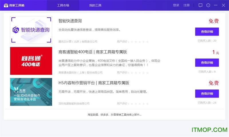 商家工具箱是专门为电商平台的商家提供专业好用的工具软件,在这里用户可以使用软件在线管理自己的店铺,通过软件可以轻松查询店铺的数据,以及专业的营销数据分析,欢迎有需要的用户来IT猫扑下载!