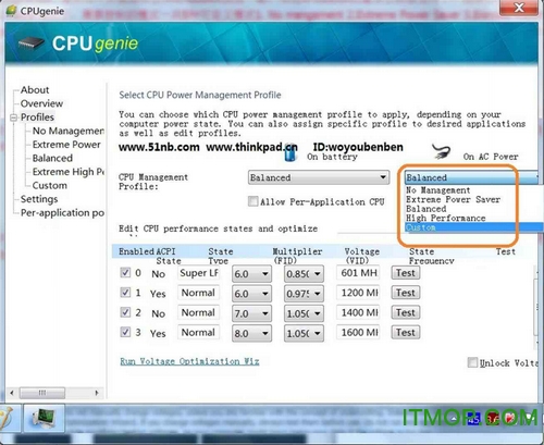 实际上每一种模式都要自行设置,而CPUgenie只能选择一种模式来运行,当然电池状态下和交流电状态下可以选择不同的模式运行,我现在选择的是电池情况下不管理,交流电才使用CUSTOM模式来管理