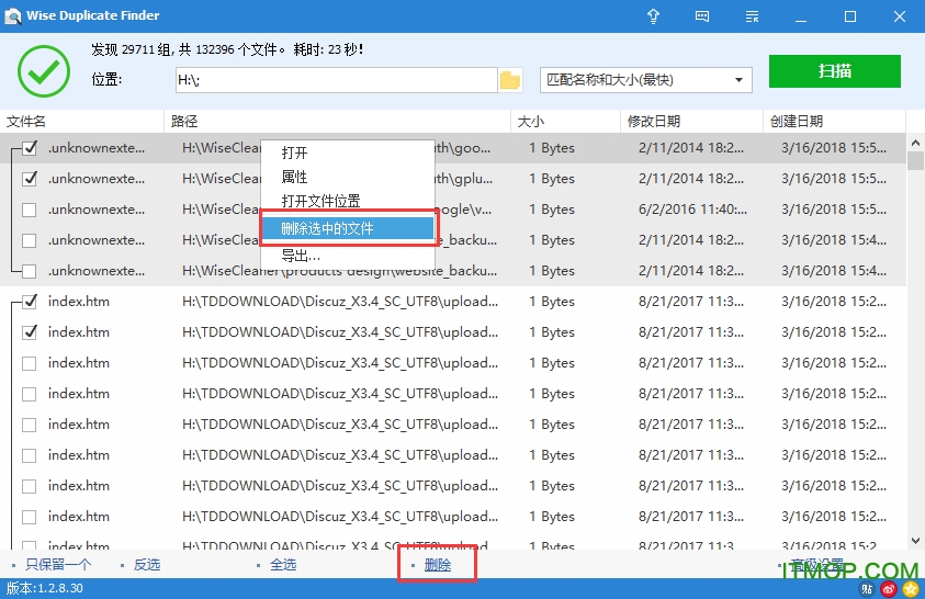 免费版用户只能手工逐一勾选需要删除的重复文件,然后单击底部的“删除”按钮;如果只是删除某一个文件,可以在该文件上单击右键,选择“删除选中的文件”