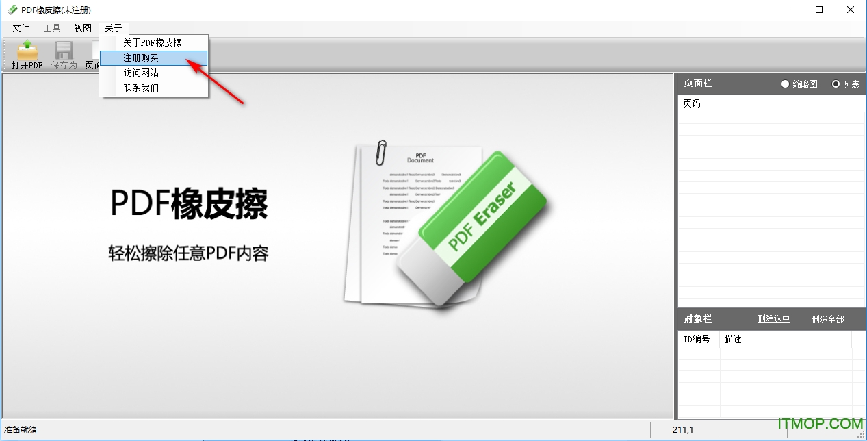 2、然后双击“PDFEraser.Patched.exe”,点击上方菜单栏中的“关于——注册购买”,如图: