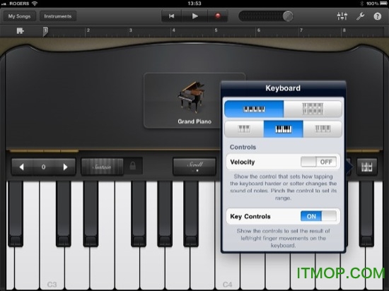 2、内置键盘可选单排键或双排键,且支持力度响应,GarageBand