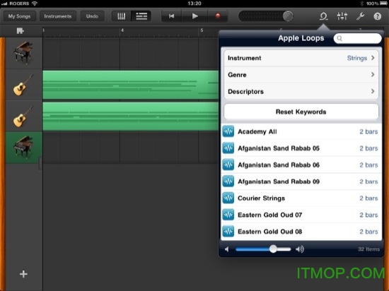 使用触控乐器、音频录音和乐段来录制、编配和混音乐曲,最多可达 32 条轨道***