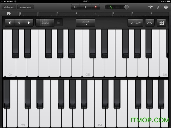 Insrtuments(触摸乐器),内置的虚拟键盘(如图1、2)、鼓组、吉他和合成器都可用于创造音乐和即兴音轨。