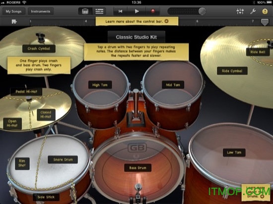 5、如果你还是喜欢自己演奏打击乐,那么可以选择标准的鼓组乐器(如图14、15),这时屏幕上显示的就是一套真鼓了。当然它也支持多点触摸好让你演奏出复杂的鼓节奏来,不过不要拿鼓槌来敲iPad啊……