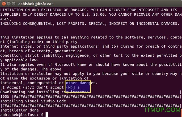 经过一系列要求和条件后,询问你是否确认安装Visual Studio Code。输入“a”来确定: