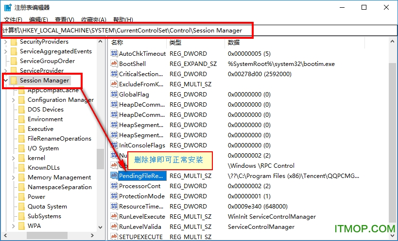 选中注册表左边的文件夹“HKEY_LOCAL_MACHINE\System\CurrentControlSet\Control\Session Manager”中的“PendingFileRenameOperations”,删除右边窗口中的条目不用重新启动计算机,就可以安装软件了