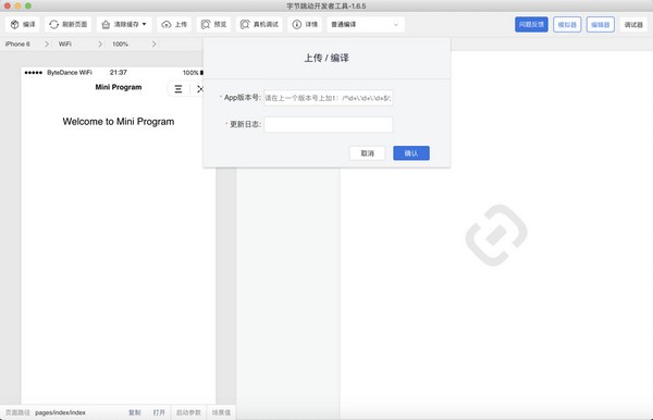 点击工具栏的"上传"按钮,填写版本号(版本号不能重复,需在上一个版本号上加 1), 填写更新日志,点击确认上传至开发者平台。