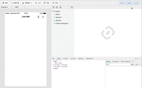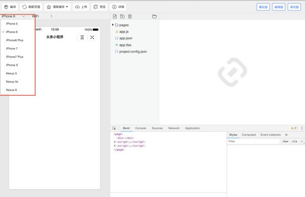 模拟器模拟头条小程序在客户端真实的逻辑表现,对于绝大部分的 API 均能够在模拟器上呈现出正确的状态。开发者可以选择不同的设备,调试小程序在不同尺寸机型上的适配问题。