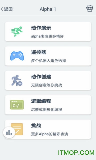 Alpha 1 app是专为阿尔法Alpha智能机器人打造的手机端操控软件,支持Alpha 1s和Alpha 1 pro机器人,蓝牙一键连接之后,就能通过APP对机器人进行动作指令,还有动作商店,支持下载。有需要的朋友快来IT猫扑网下载吧!