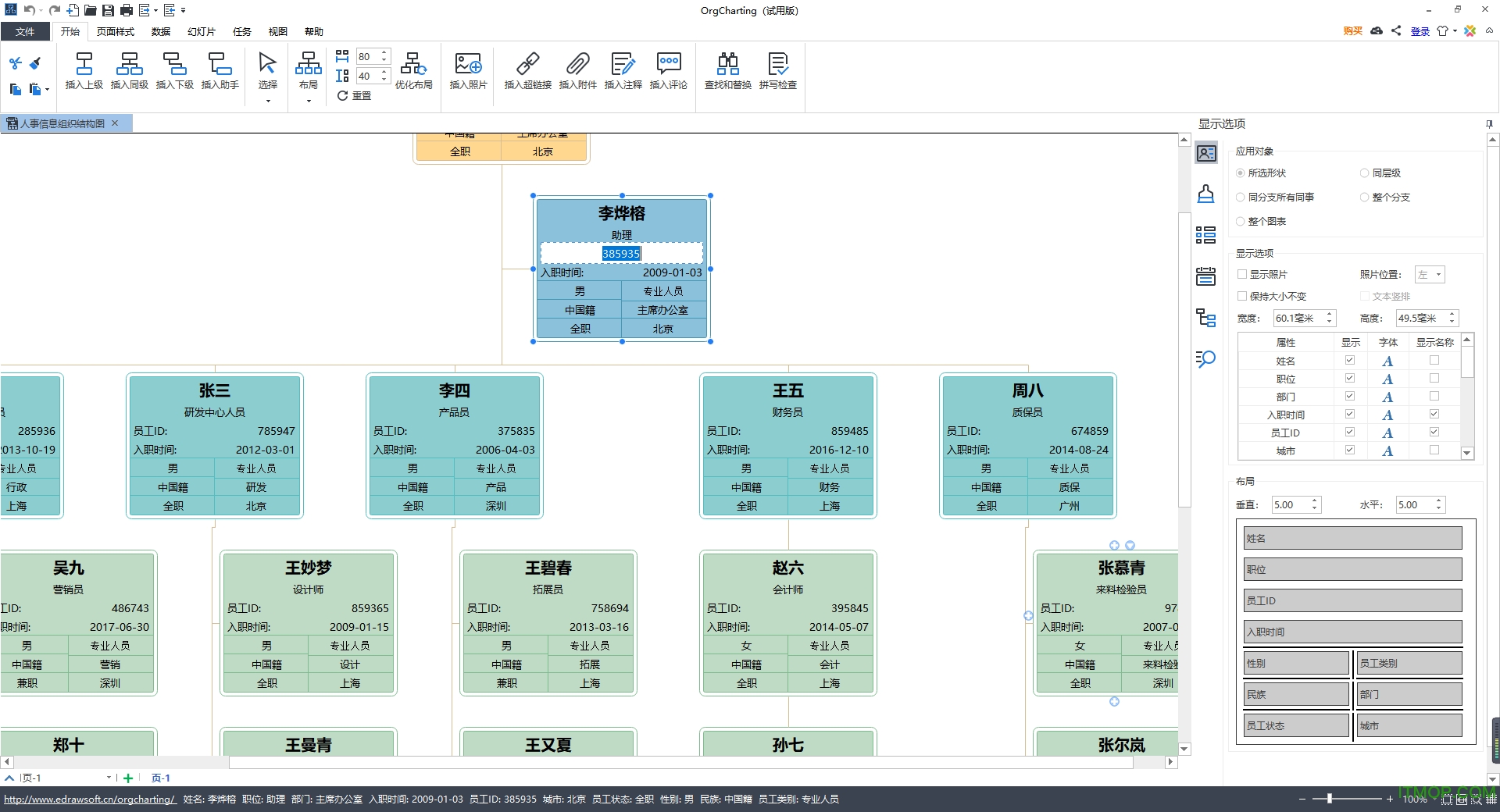 “视图选项”可以帮助你快速切换形状上所显示的人员信息。比如说:针对人事部门的人事、入职相关的信息;针对财务的薪酬、劳动合同相关的信息;针对管理者的组织架构、职位相关的信息等等。