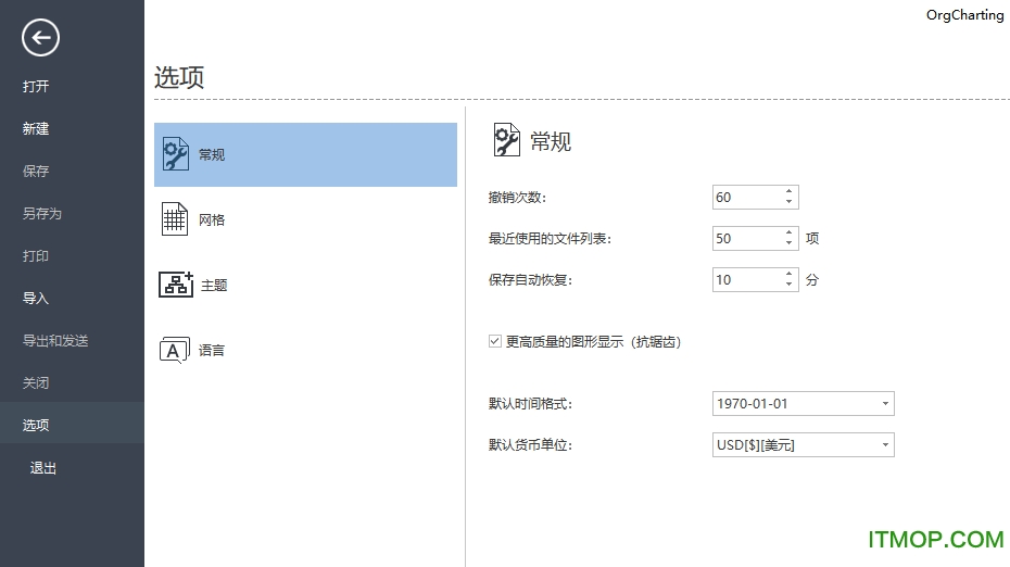 【选项】设置中包括常规、网络、主题、语言四项设置。
