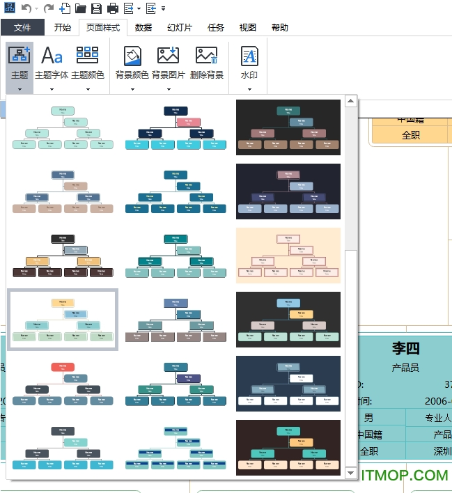 5.OrgCharting软件中提供了多种主题风格和配色方案,只需要简单的操作,就能将单调的组织架构图变得更美观、更有吸引力。